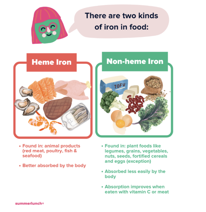 There are 2 types: heme (from animal sources) and non-heme (from plant sources). Non-heme iron is less absorbed, but pairing it with vitamin C or meat can help boost absorption (like squeezing lemon on leafy greens).