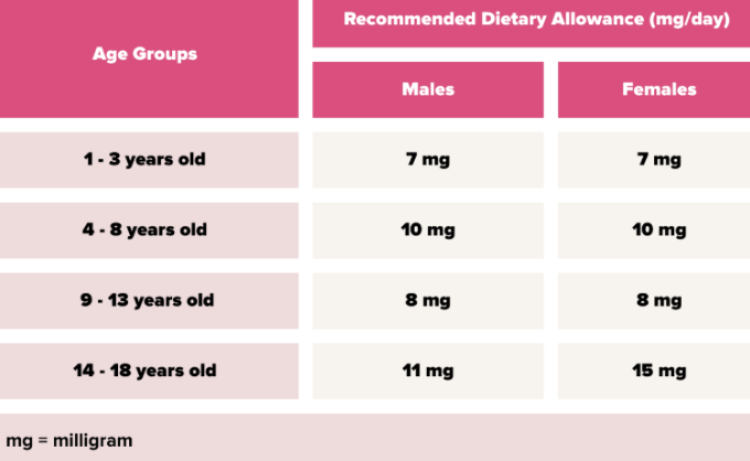 How much iron your child needs depends on their age and gender. The body can adjust a bit, but these are the general recommended amounts for most children: