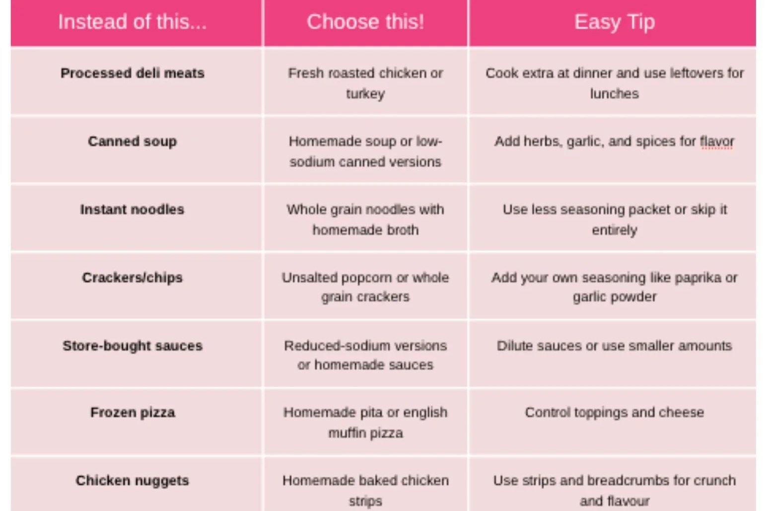 Remember, every small change counts: swapping a salty snack for a fruit, cooking at home once or twice a week, or experimenting with herbs instead of salt can make a meaningful difference over time. Here are a few simple swaps that can help lower sodium while keeping meals flavorful.
