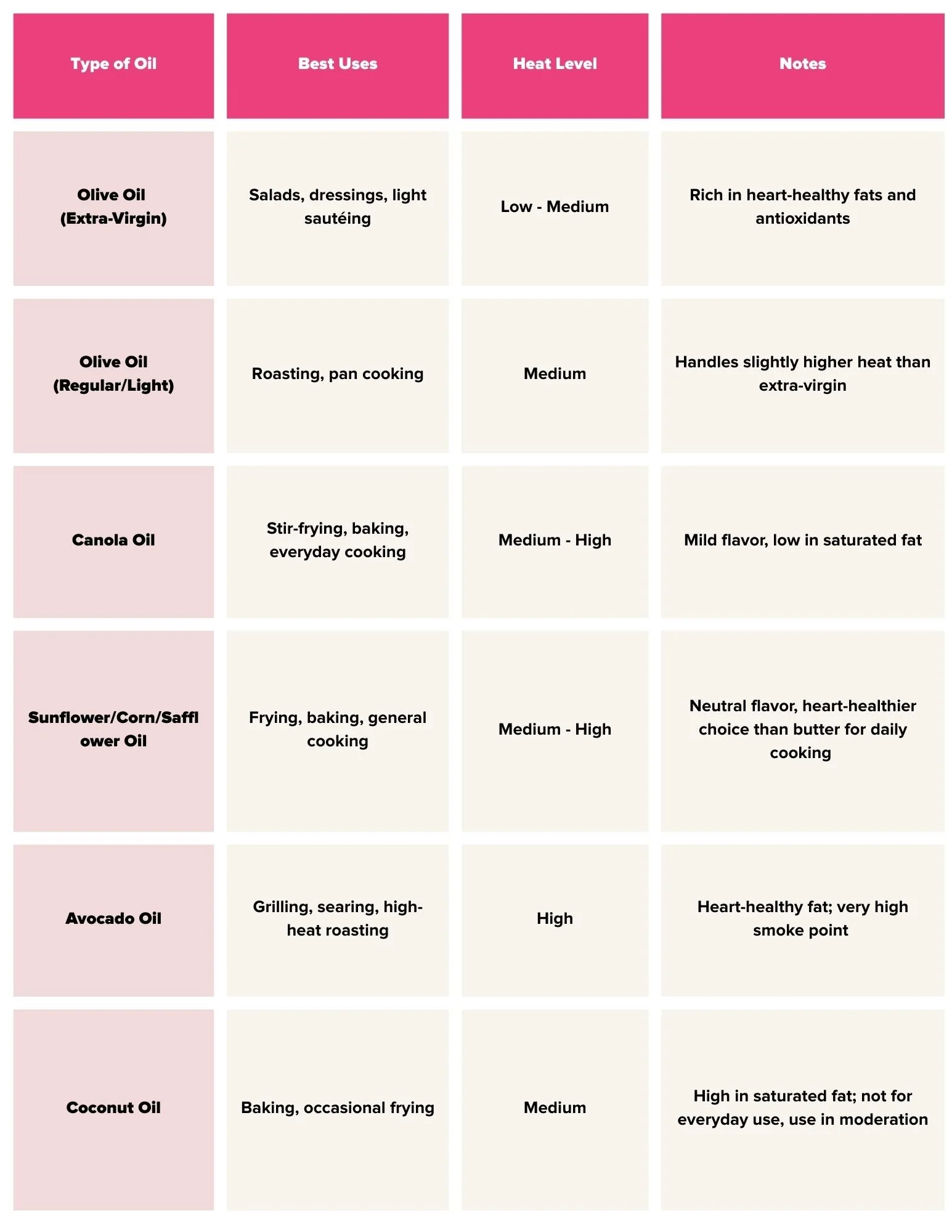 Unlock Food. How to use different oils when cooking [Internet]. Toronto (ON): Dietitians of Canada. 2018 Jun 13 [cited 2026 Feb 23]; [about 3 screens]. Available from: https://www.unlockfood.ca/en/Articles/Cooking-And-Food/Cooking-Methods/How-To-Use-Different-Oils-When-Cooking
