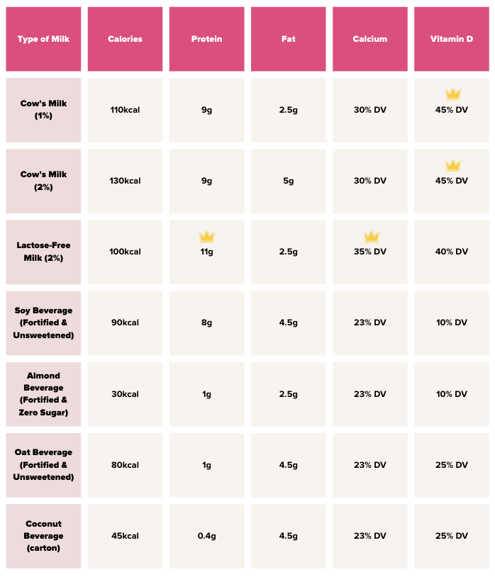Cow’s milk naturally contains calcium and is fortified with vitamin D in Canada. Many plant-based beverages are fortified with these nutrients as well, but the amounts vary by brand, so checking the Nutrition Facts table is important.